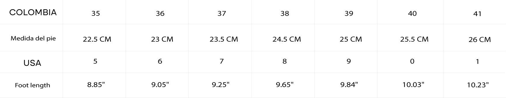 Nuestros zapatos calzan a la medida con tu talla real. Si estás decidiendo entre tallas, te recomendamos que elijas la talla basándote en la tabla a continuación. VER TABLA